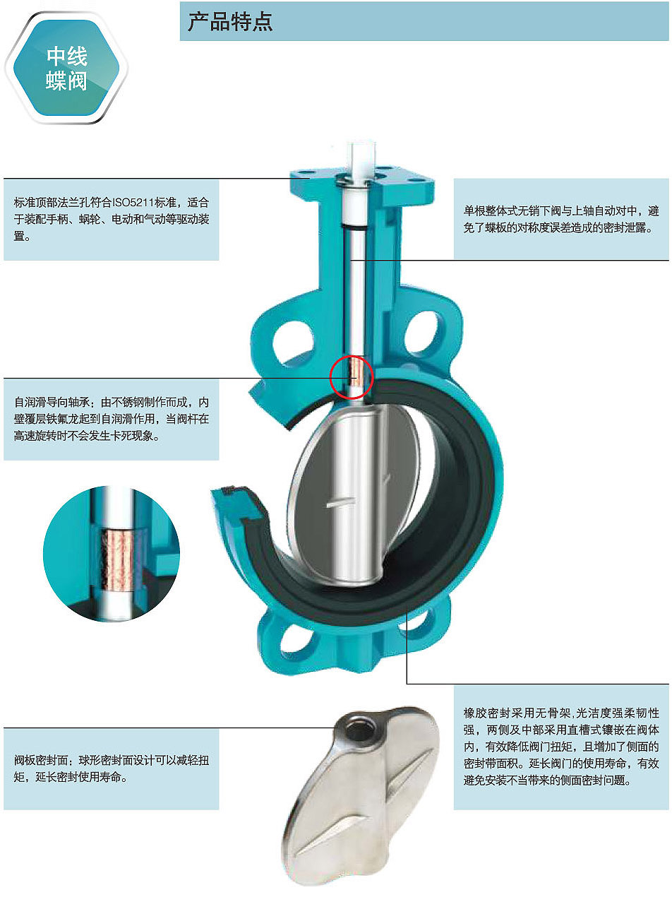 閥體:灰鑄鐵,球墨鑄鐵,鑄鋼,304不銹鋼,316不 銹鋼,316L不銹鋼 閥板:球鐵尼龍,球鐵電鍍,304不銹鋼,316不銹 鋼,316L不銹鋼,雙相不銹鋼,鋁青銅 閥座:三無乙丙(EPDM),丁腈(NBR),耐溫乙 丙(EPDM),氟橡膠,硅橡膠 閥軸:45碳鋼,410不銹鋼,304不銹鋼,316不銹鋼 公稱通徑:DN50-DN600 公稱壓力:PN1.0-1.6Mpa 適用介質:水,海水,污水,油,空氣,食品,弱酸 堿等 使用溫度:-20~220℃